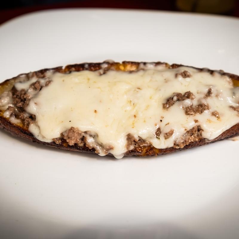 Sweet plantain lightly deep fried stuffed with seasoned prime ground beef and cheese
